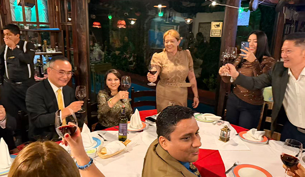 In the evening, Mr. Peter Li hosted a dinner at La Casa di Carlo restaurant in Guayaquil, joined by Ms. Maria Fernanda, President of the Ecuador Direct Selling Association, Mr. Alex Bohorquez, international leader of Colombia Branch, and 14 local Three-Star and above Diamond leaders.